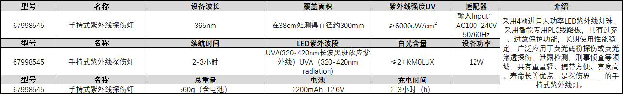·采用4颗进口大功率LED紫外线灯珠,采用智能专用PLC线路板,具有过充、过放保护功能,长期使用性能稳定,广泛应用于荧光磁粉探伤或荧光渗透探伤,泄露检测,刑事侦查等领域,具有重量轻、携带方便、亮度高、寿命长等优点,是探伤界首选的手持式紫外线灯。