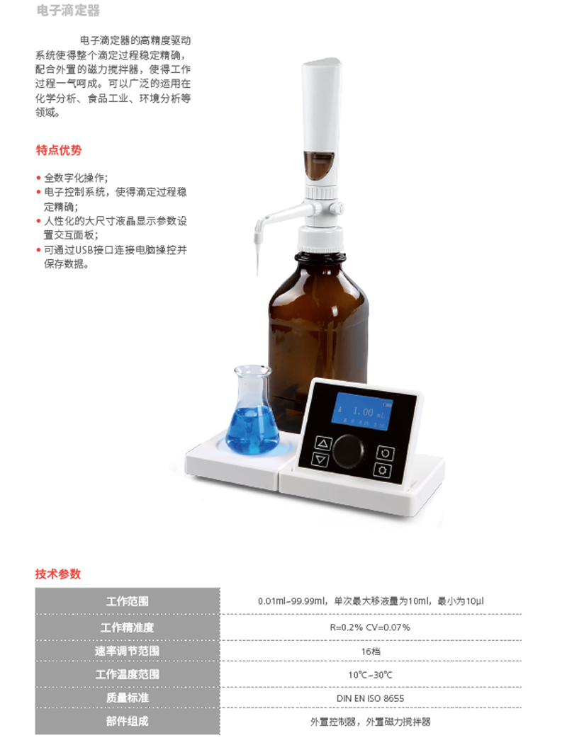 ·全数字化操作; ·电子控制系统,使得滴定过程稳定精确; ·人性化的大尺寸液晶显示参数设置交互面板; ·支持数据的存储和传输。