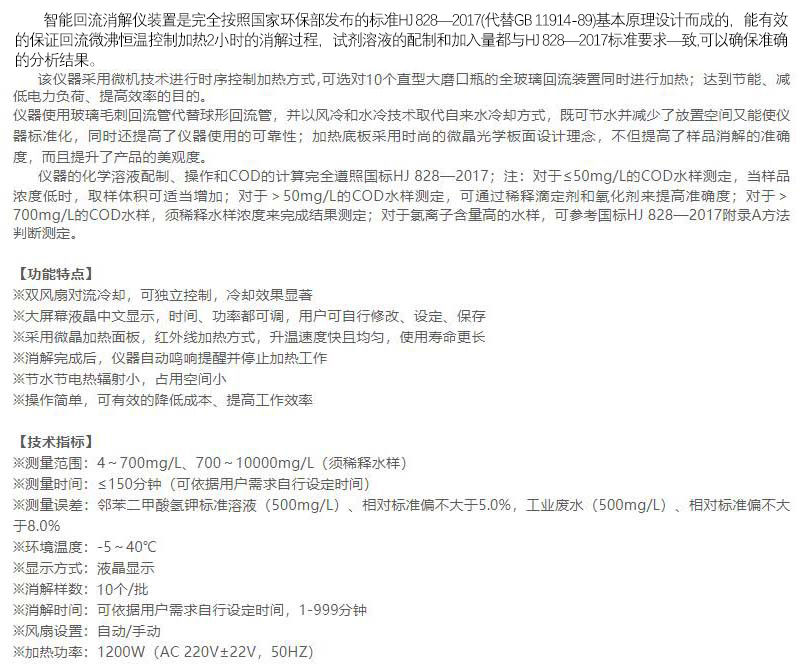 ·双风扇对流冷却,可独立控制,冷却效果显著 ·大屏幕液晶中文显示,时间、功率都可调,用户可自行修改、设定、保存 ·采用微晶加热面板,红外线加热方式,升温速度快且均匀,使用寿命更长 ·消解完成后,仪器自动鸣响提醒并停止加热工作 ·节水节电热辐射小,占用空间小 ·操作简单,可有效的降低成本、提高工作效率