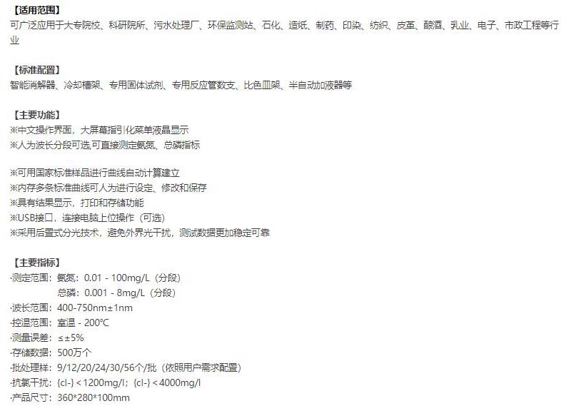 ·中文操作界面,大屏幕指引化菜单液晶显示 ·人为波长分段可选,可直接测定COD、氨氮指标 ·仪器可根据标准样品来计算存储曲线 ·内存多条标准曲线可人为进行设定、修改和保存 ·具有结果显示,打印和存储功能 ·USB接口,连接电脑上位操作(可选) ·采用后置式分光技术,避免外界光干扰,测试数据更加稳定可靠
