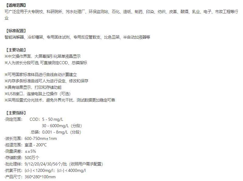 ·中文操作界面,大屏幕指引化菜单液晶显示 ·人为波长分段可选,可直接测定COD、氨氮指标 ·仪器可根据标准样品来计算存储曲线 ·内存多条标准曲线可人为进行设定、修改和保存 ·具有结果显示,打印和存储功能 ·USB接口,连接电脑上位操作(可选) ·采用后置式分光技术,避免外界光干扰,测试数据更加稳定可靠
