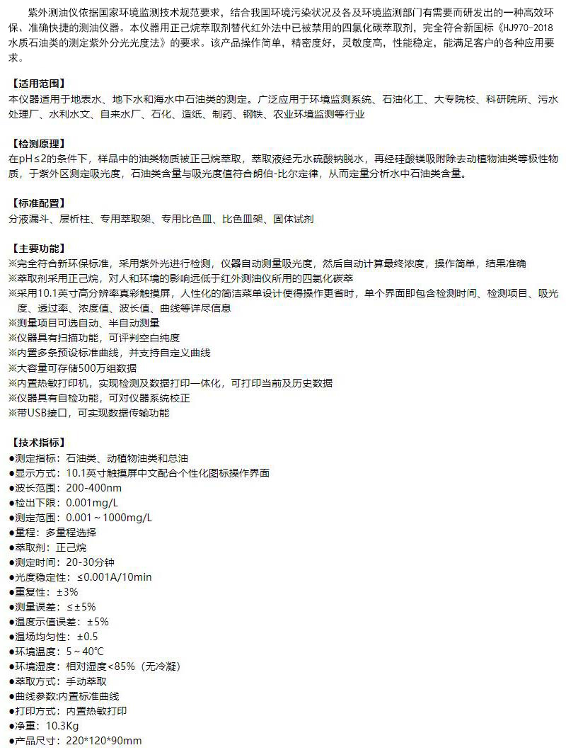 ·完全符合新环保标准,采用紫外光进行检测,仪器自动测量吸光度,然后自动计算最终浓度,操作简单,结果准确 ·萃取剂采用正己烷,对人和环境的影响远低于红外测油仪所用的四氯化碳 ·采用10.1英寸高分辨率真彩触摸屏,人性化的简洁菜单设计使得操作更省时,单个界面即包含检测时间、检测项目、吸光度、透过率、浓度值、波长值、曲线等详尽信息 ·测量项目可选自动、半自动测量 ·仪器具有扫描功能,可评判空白纯度 ·内置多条预设标准曲线,并支持自定义曲线 ·大容量可存储500万组数据 ·内置热敏打印机,实现检测及数