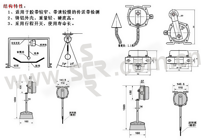 ·用于对胶带运输机输送物料的检测,可发出有载运信号,重量轻、硬度高,采用行程开关,使用寿命长,有良好的抗震动性,有较好的防水性