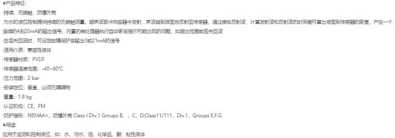 ·为水的液位控制提供持续的无接触测量,超声波脉冲向容器中发射,声波碰到液面后反射回传感器,通过接收反射波,计算发射波和反射波的时间差可算出液面到传感器的距离,产生一个连续的4到20mA的输出信号,内置的微处理器执行自诊断来指示可能出现的问题,如超出范围或丢失回波