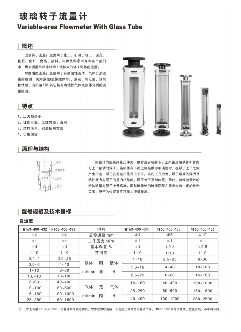 测量液体:0.4~4ml/min,0.6~6ml/min,1~10ml/min,1.6~16ml/min测量气体:6~60ml/min,10~100ml/min,16~160ml/min,25~250ml/min