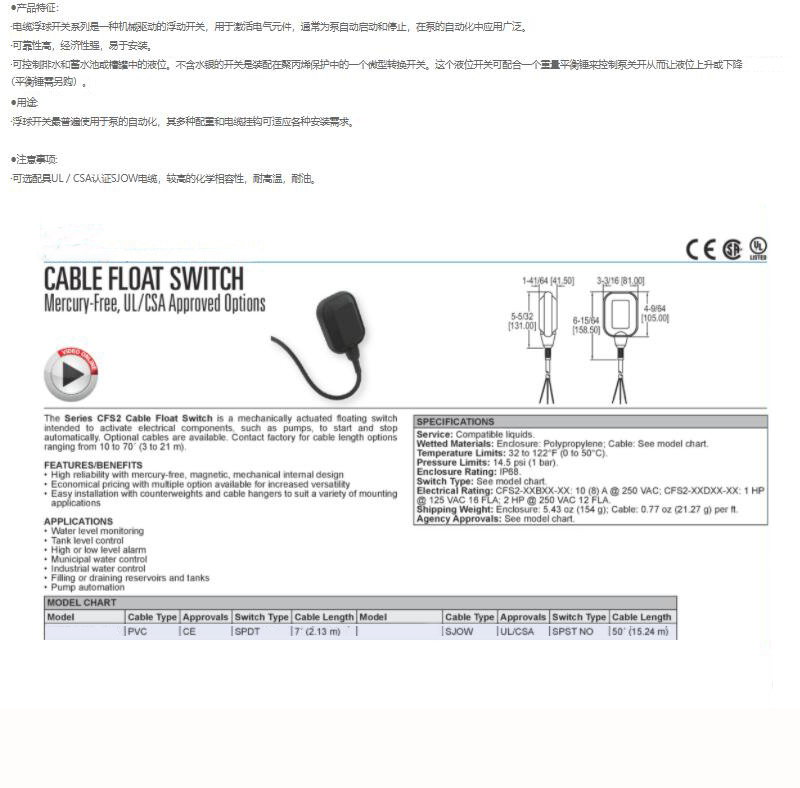 ·电缆浮球开关系列是一种机械驱动的浮动开关,用于激活电气元件,通常为泵自动启动和停止,在泵的自动化中应用广泛。