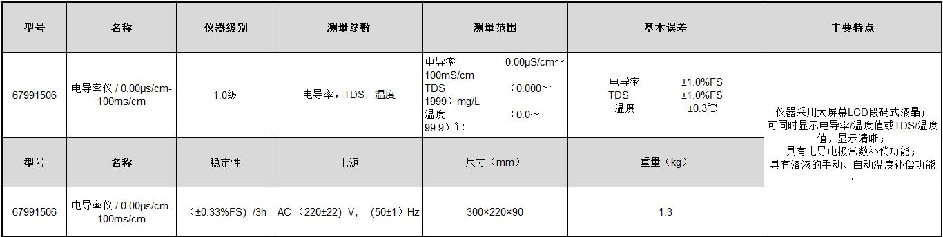 B17546 67991507 67991507 1.0级 电导率 电导率0.00μS/cm~100mS/cm TDS/ 温度/ 电导率±1.0%FS TDS/ 温度/ (±0.33%FS)/3h AC(220±22)V,(50±1)Hz 300×220×90mm 1.3KG 9040.00