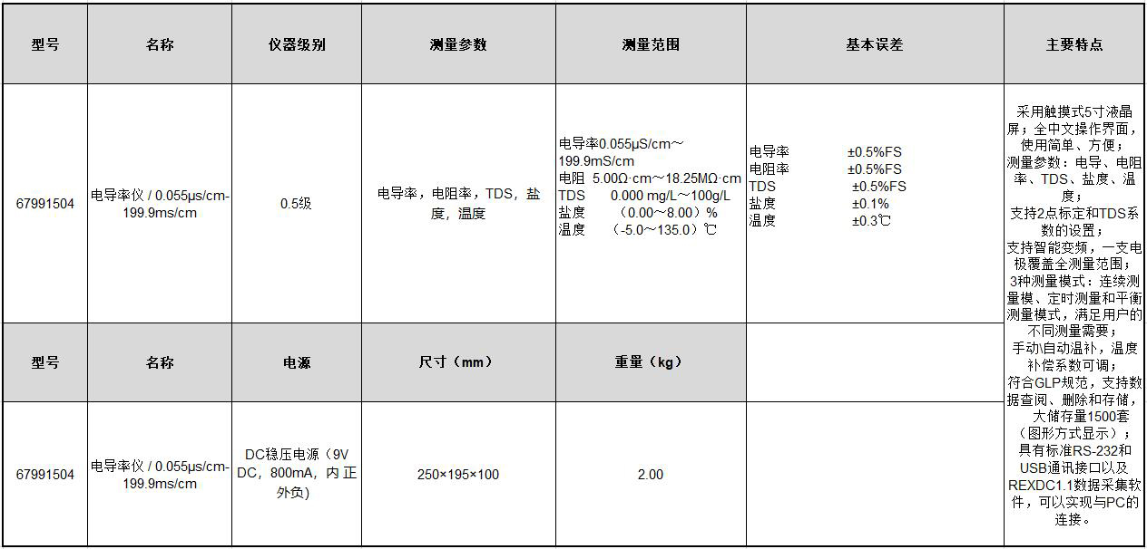 规格:  0.055μS cm~199.9mS cm 5.00Ω·cm~18.25MΩ·cm 制造商型号:  67991504