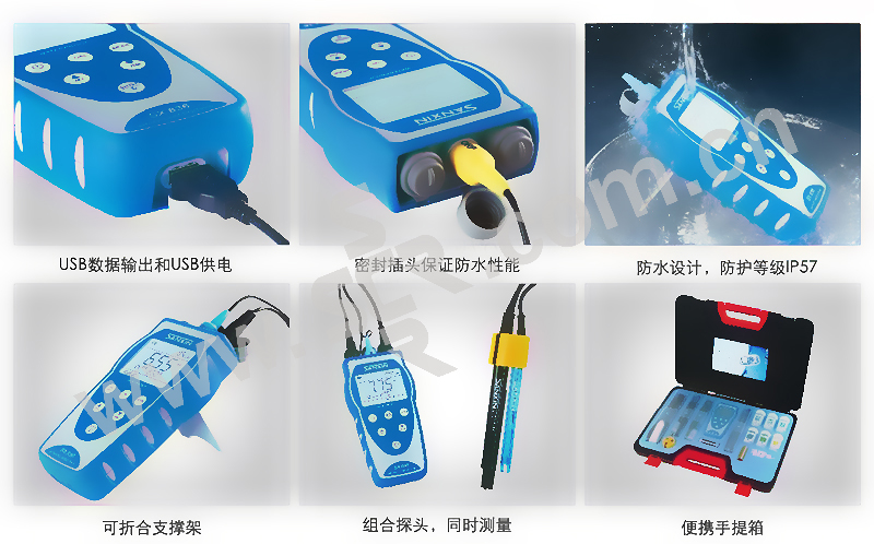 ·有四个校准点可供选择,有校准指引和自动检查功能·可切换电导率、TDS、盐度和电阻率测量模式。TDS测量可调节系数·自动识别8种电导率标准溶液,有二个系列的标准溶液可以选择,有自定义溶液校准·自动切换量程,对小于10μS/cm的纯水和高纯水,自动进行非线性温度补偿,大大提高了高纯水电导率的测量准确度,适合电力、微电子和医药行业的使用·配置校准溶液和手提箱,适合野外和现场使用·符合IP57防水等级