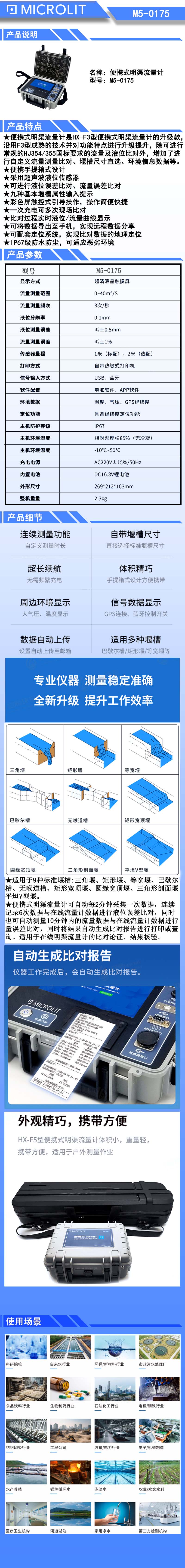 *便携手提箱式设计 *采用超声波液位传感器 *可进行液位误差比对、流量误差比对 *九种基本堰槽属性输入提示 *彩色屏触控式引导操作,操作简便快捷 *一次充电可多次现场比对 *比对过程实时液位/流量曲线显示 *可将数据导出至手机,实现远程数据分享 *可配套定位系统,实现比对数据的地理定位 *IP67级防水防尘,可适应恶劣环境