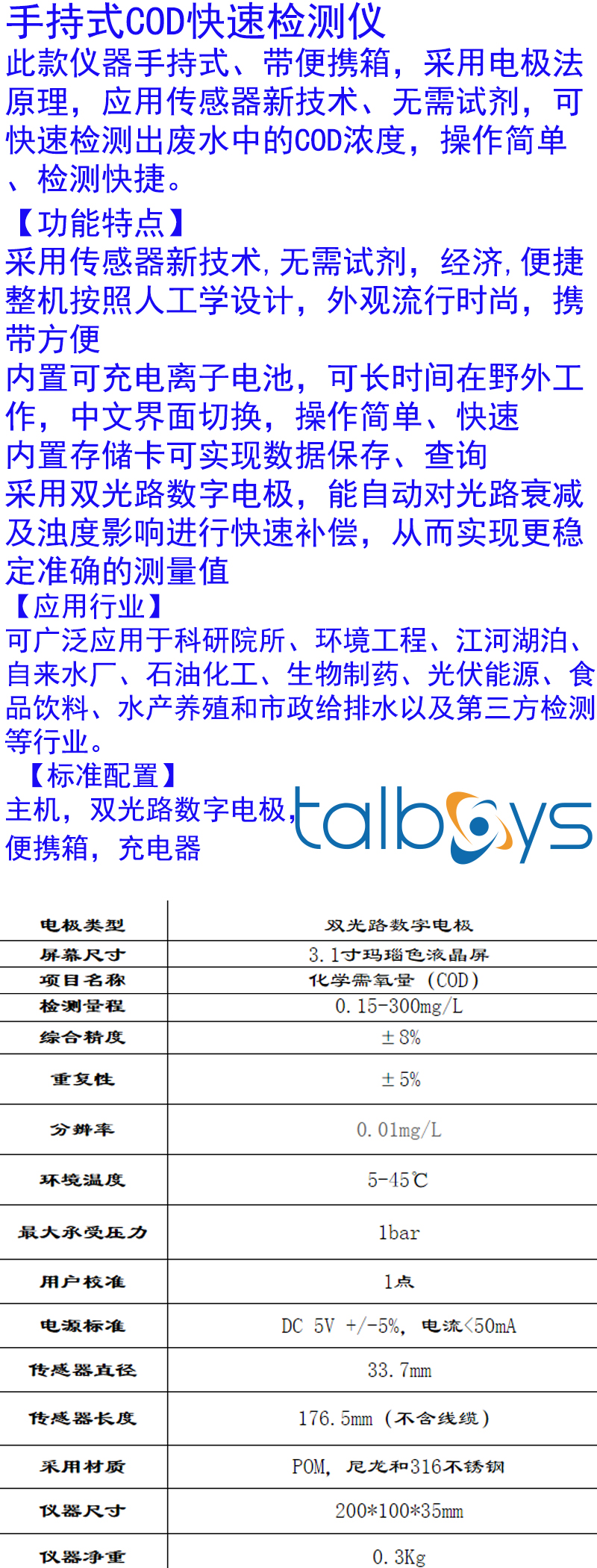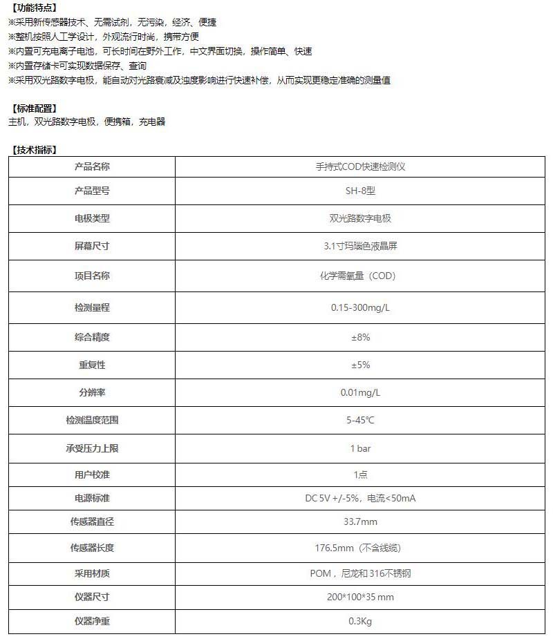 ·该产品电极采用数字信号代替模拟信号,测量精准,无干扰;电极防水等级达到IP68可适应于各种恶劣的环境,适应满量程电导率的测量,数字通讯接口,具有响应时间快,读数稳定,不受极化影响等特点。标准配置:主机,双光路数字电极,便携箱,充电器