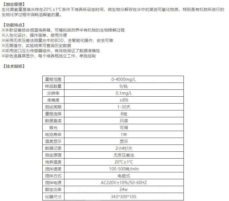 ·本款设备结合恒温培养箱,可模拟自然界中有机物的生物降解过程 ·人性化设计,操作简单,使用方便 ·采用无汞压差法测量水中的BOD,全智能化操作,安全可靠 ·无需值守,实验结束可查询历史数据 ·采用进口压力传感器组件,有效地保证了数据准确性 ·彩色液晶屏显示,每个培养瓶独立工作,单独控制 ·生化需氧量是指水样在20℃±1℃条件下培养所设定时间,微生物分解存在水中的某些可氧化物质,特别是有机物所进行的生物化学过程中消耗溶解氧的量。