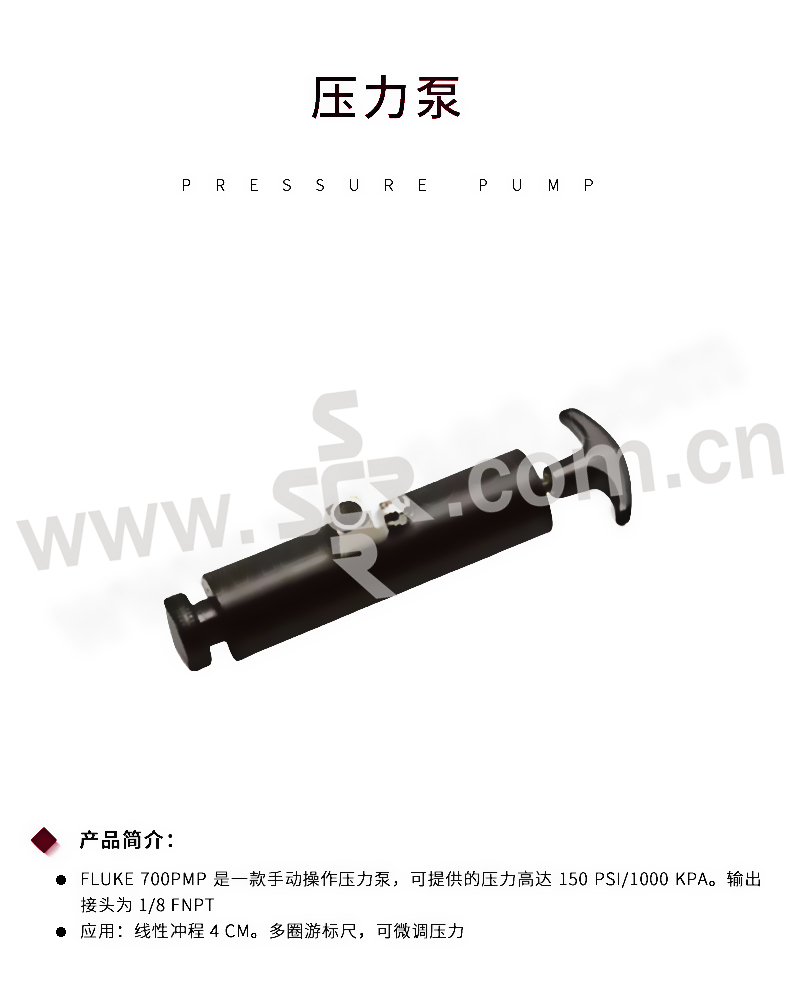 ·Fluke 700PMP 是一款手动操作压力泵,可提供的压力高达 150 psi/1000 kPa。输出接头为 1/8 FNPT。