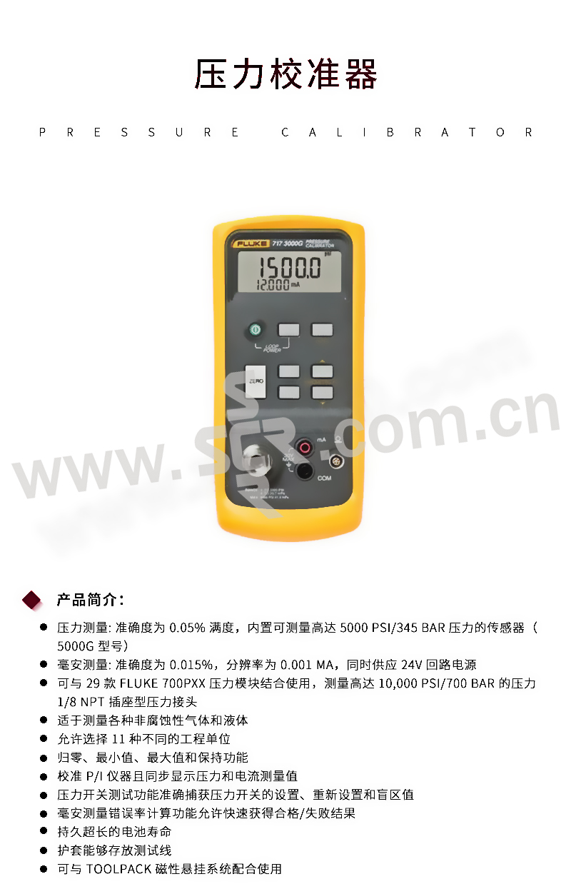·压力测量: 准确度为 0.05% 满度,内置可测量高达 5000 PSI/345 bar 压力的传感器(5000G 型号)·毫安测量: 准确度为 0.015%,分辨率为 0.001 mA,同时供应 24V 回路电源·可与 29 款 Fluke 700Pxx 压力模块结合使用,测量高达 10,000 psi/700 bar 的压力·1/8 NPT 插座型压力接头·适于测量各种非腐蚀性气体和液体·允许选择 11 种不同的工程单位·归零、最小值、最大