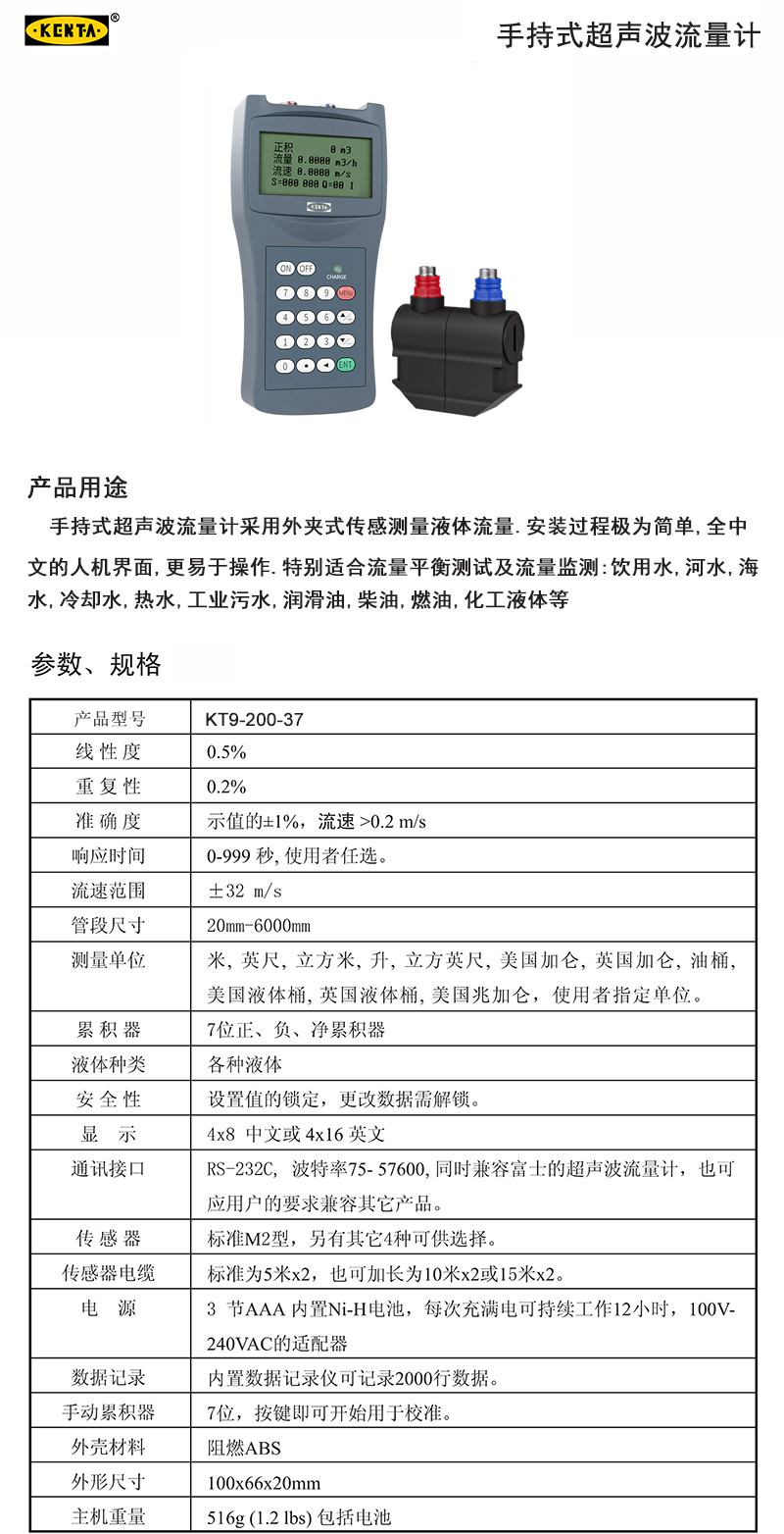 ·手持式超声波流量计采用外夹式传感测量液体流量.安装过程极为简单, 全中文的人机界面,更易于操作.特别适合流量平衡测试及流量监测:饮用 水,河水,海水,冷却水,热水,工业污水,润滑油,柴油,燃油,化工液 体等