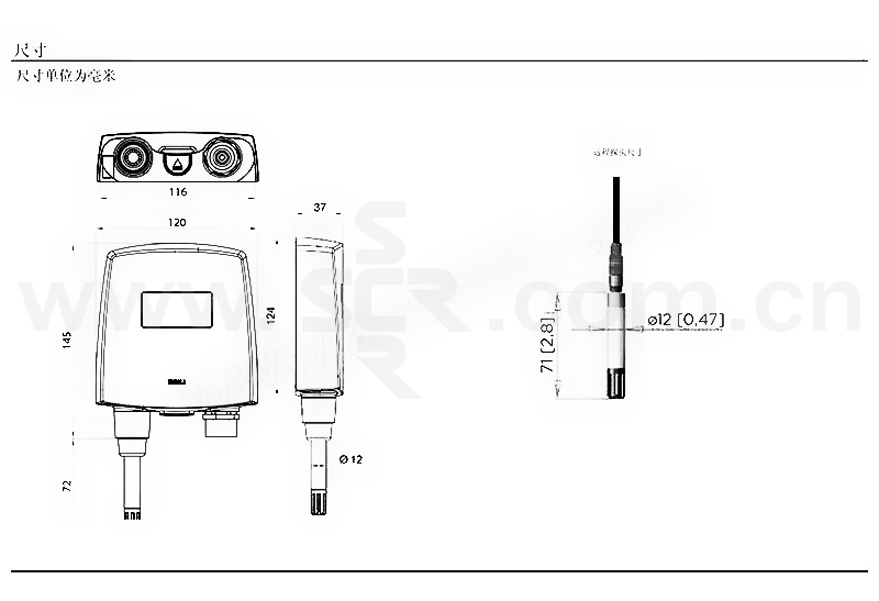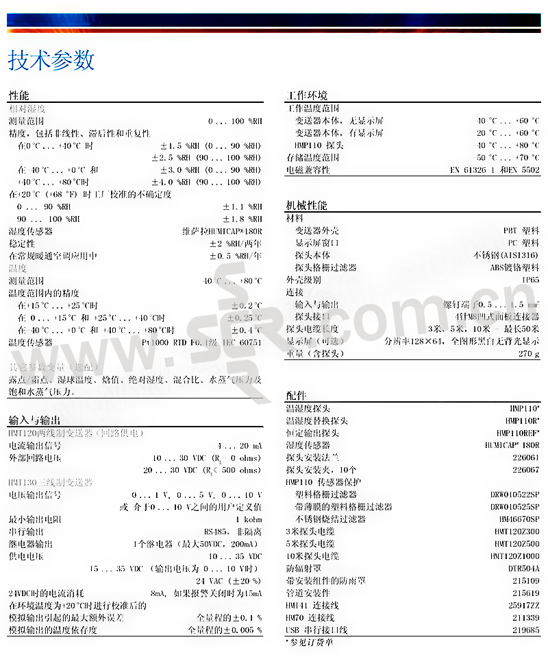 ·维萨拉HUMICAP®技术,配备 HUMICAP® 180R湿度传感器·湿度参数可选项:相对湿度、露 点/霜点、湿球温度、焓值、绝对 湿度、混合比、水蒸气压力及饱 和水蒸气压力。 ·两线制回路供电或三线制电压输 出结构 ·可互换探头(便于现场校准) ·精确可靠 ·可抵御灰尘和大部分化学污染物 品的影响 ·可选LCD显示屏 ·USB连接线,可用于维护时连接PC ·壁挂式或配备远程探头 ·可提供恒定输出探头,易于现场
