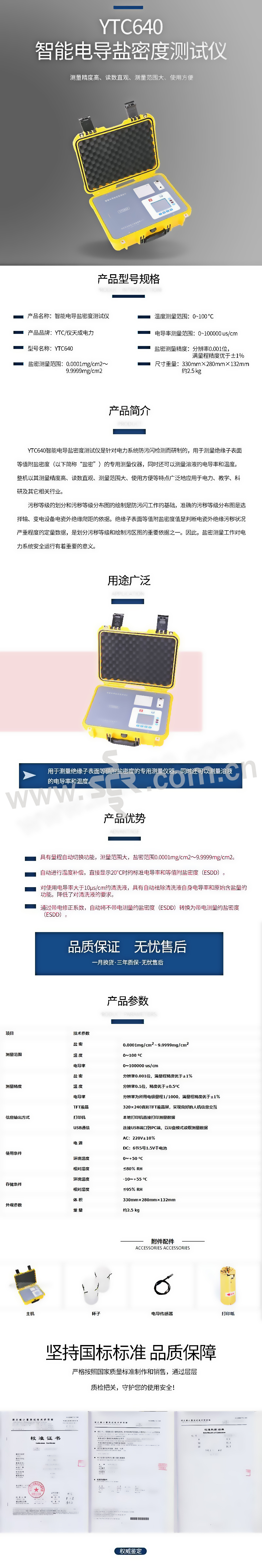 ·具有量程自动切换功能,测量范围大,盐密范围0.0001mg/cm2~9.9999mg/cm2。·自动进行温度补偿,直接显示20℃时的标准电导率和等值附盐密度ESDD。·对使用电导率大于10μs/cm的清洗液,具有自动祛除清洗液自身电导率和原始含盐量的功能。降低了对清洗液的要求。·通过带电修正系数,自动将不带电测量的盐密度ESDD转换为带电测量的盐密度ESDD。