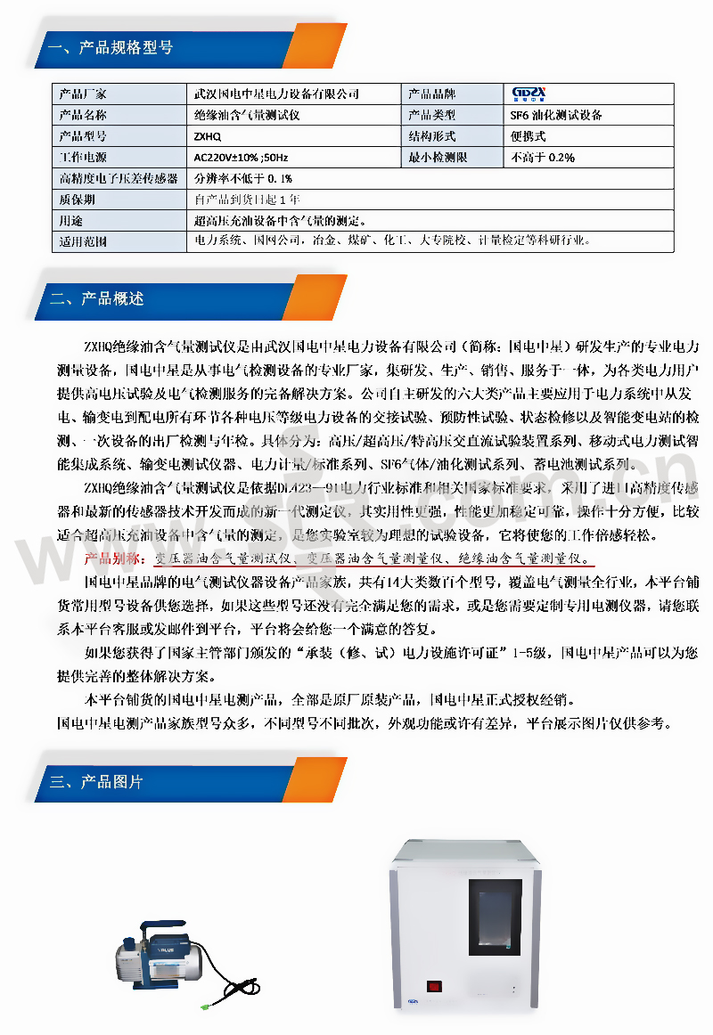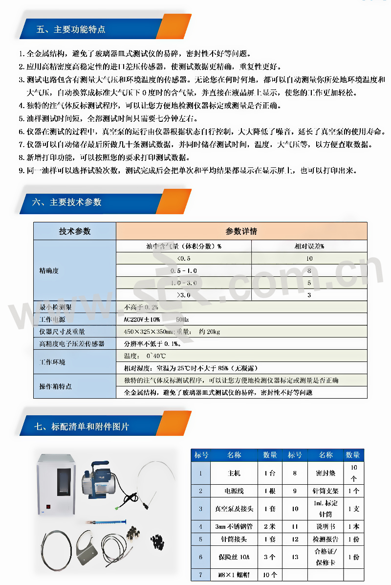 ·运用DL423-91真空压差法标准,检测灵敏度<0.2%,准确度符合标准要求;·全金属结构避免了以前玻璃管式测试仪易碎,密封困难等问题;·自动实现油样定量,数据检测,测试结果,最示数据,储存,排油等功能.