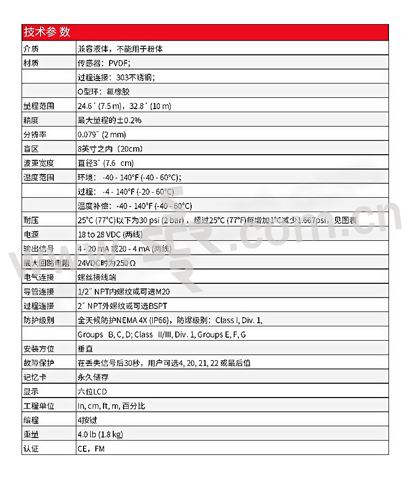 ·ULT系列 超声波液位变送器能可靠地,无接触地精确测量液位。·没有任何移动部件,不接触介质,这样不会有被磨损,粘附,堵塞等问题。·采用3英寸发射头锥形发射,配合映射软件,不需担心人梯,管线或其他储罐配套设备等对超声波的干扰。·它有FM防爆认证,可用于危险场合。·带六位数显,很容易编程配置。输出范围可调,自动校准。·带有输出故障保护功能和自测试功能,安全性能高。