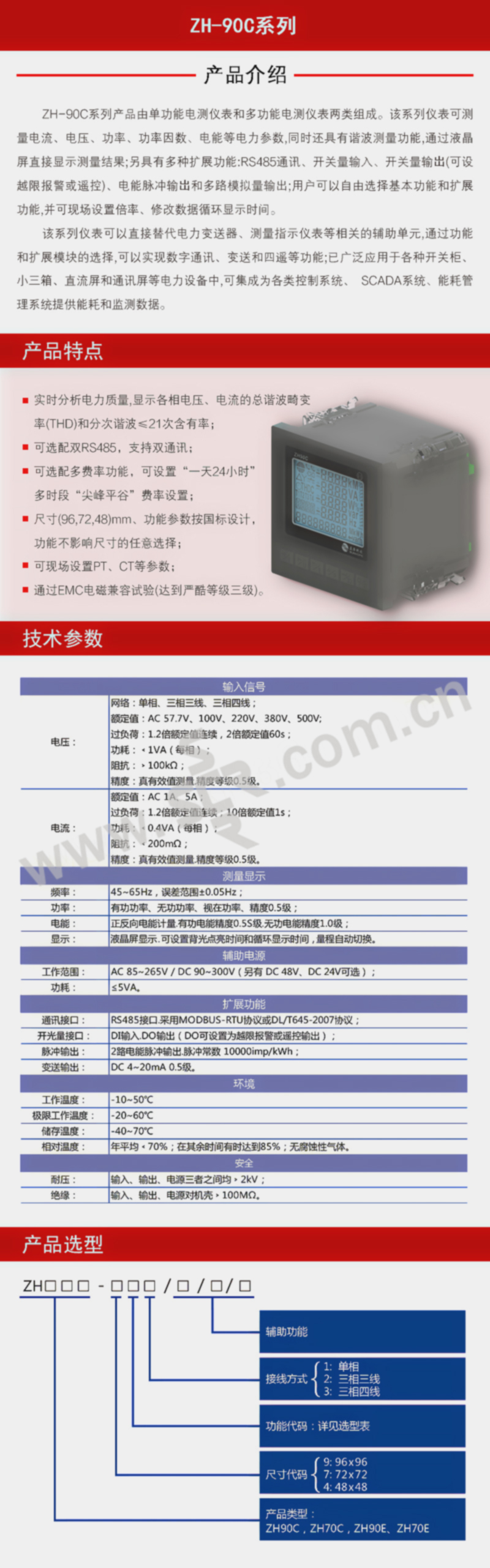 SUNHOPE/正华科技 90C系列智能电力仪表全电量表 ZH70E-(DS) 数码 单相电流 电压 有功电能 分时电量 1台