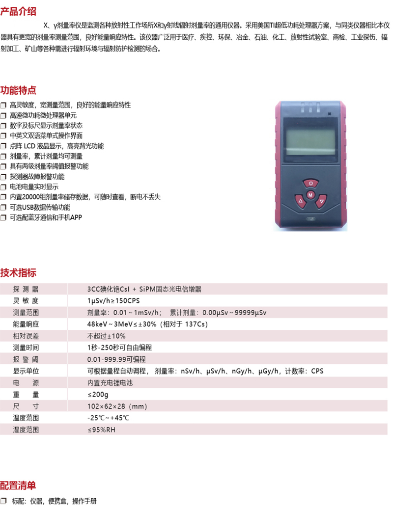 ·高灵敏度,宽测量范围,良好的能量响应特性 ·高速微功耗微处理器单元 ·数字及标尺显示剂量率状态 ·中英文双语菜单式操作界面 ·点阵LCD液晶显示,高亮背光功能 ·剂量率,累计剂量均可测量 ·具有两级剂量率阈值报警功能 ·探测器故障报警功能 ·电池电量实时显示 ·内置20000组剂量率储存数据,可随时查看,断电不丢失 ·可选USB数据传输功能 ·可选配蓝牙通信和手机APP