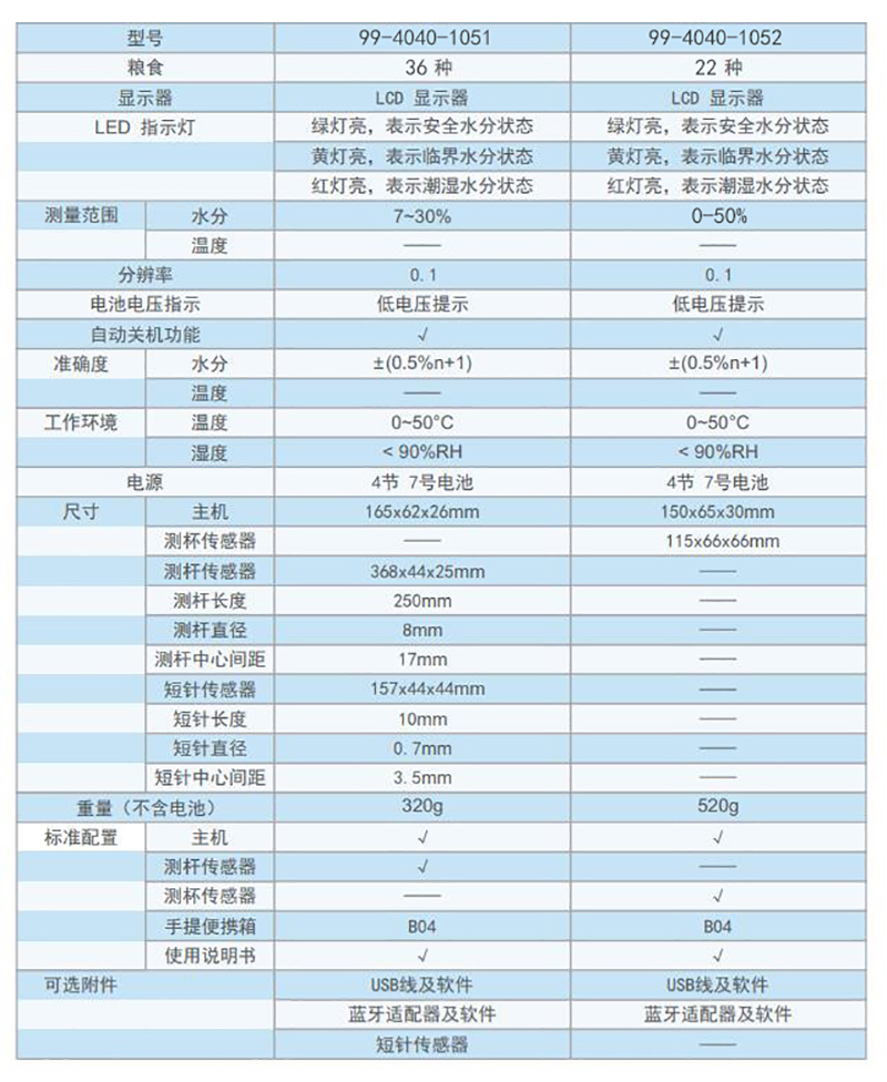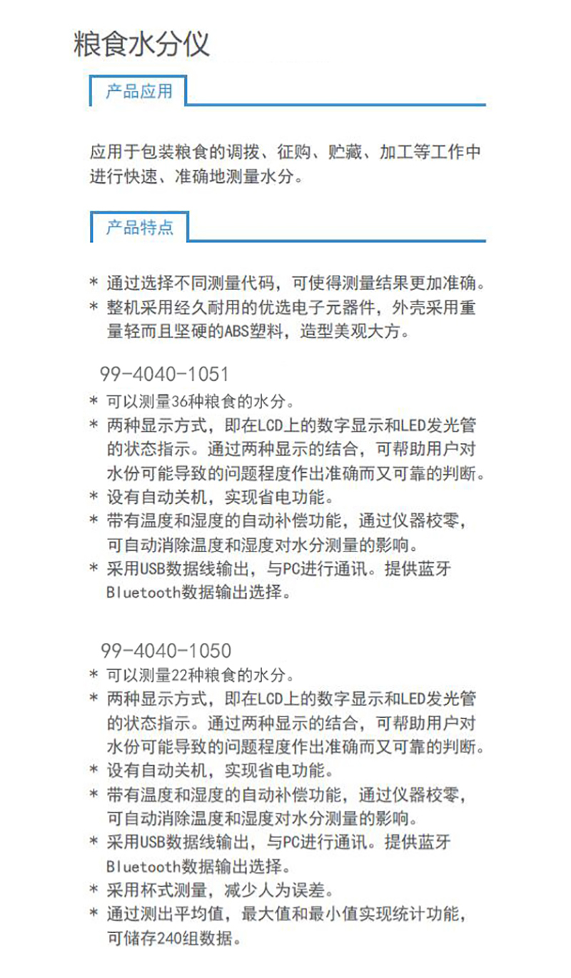 ·两种显示方式,即在LCD上的数字显示和LED发光管的状态指示。通过两种显示的结合,可帮助用户对水份可能导致的问题程度作出准确而又可靠的判断。 ·设有自动关机,实现省电功能。 ·带有温度和湿度的自动补偿功能,通过仪器校零,可自动消除温度和湿度对水分测量的影响。 ·采用USB数据线输出,与PC进行通讯。提供蓝牙Bluetooth数据输出选择。