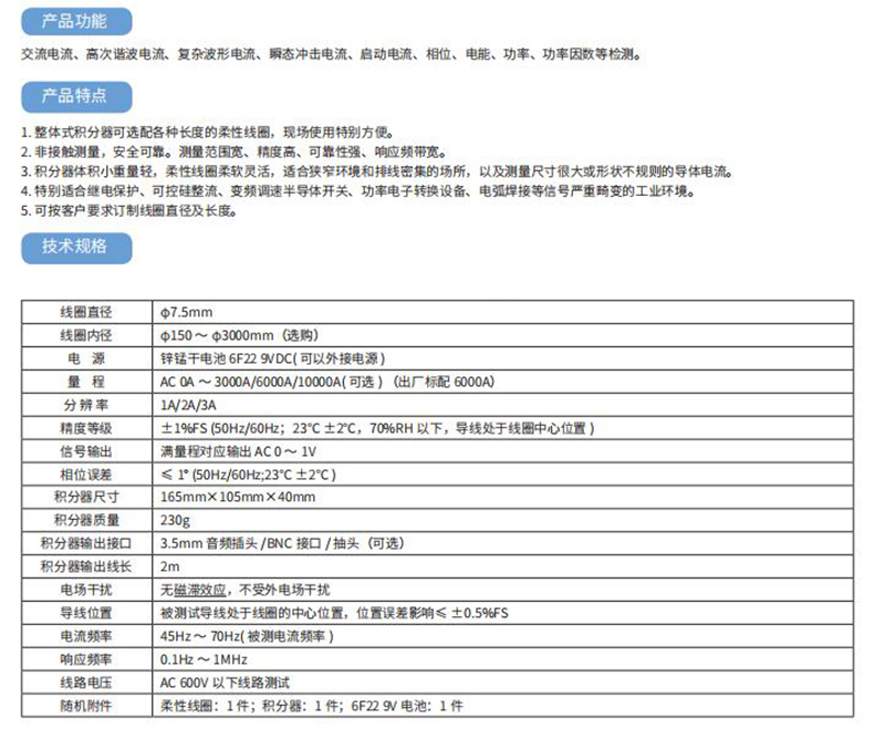 ·交流电流、高次谐波电流、复杂波形电流、瞬态冲击电流、启动电流、相位、电能、功率、功率因数等检测。