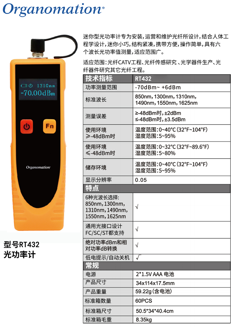 ·6种光波长选择(850nm/1300nm/1310nm/1490nm/1550nm/1625nm) ·通用光接口设计(FC/SC/ST都支持) ·绝对功率dBm和相对功率dB转换 ·电池电量显示 ·自动关机功能(可选择) ·体积小,重量轻,功耗小