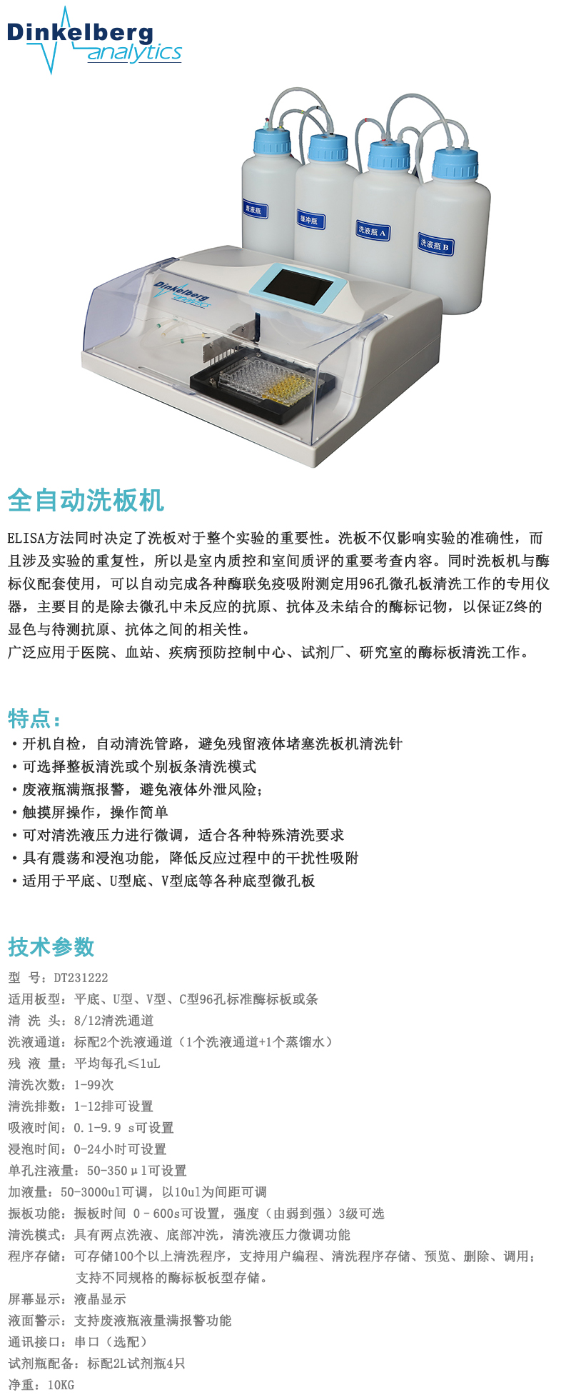 LX109190 DT231222 全自动洗板机 ·适用板型:平底、U型、V型、C型96孔标准酶标板或条 ·洗液通道:标配2个洗液通道(1个洗液通道+1个蒸馏水) ·清洗次数:1~99次 31164.00