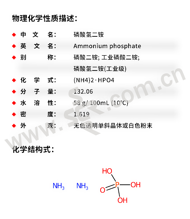 ﹒中文名称:磷酸氢二铵﹒英文名称:Ammoniumhydrogenphosphate﹒分子式:(NH4)2HPO4﹒分子量:132。06﹒性状:白色结晶或粉末。无气味。具咸凉味。置空气中可失去8%氨。溶于水、热水中溶解度为1G/1。7ml、冷水中溶解度为1G/0。5ml、不溶于乙醇和丙酮。pH约为8。相对密度1。619。