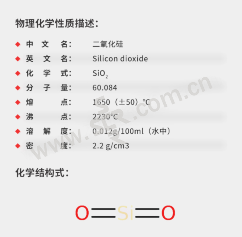 ·中文名称:二氧化硅·英文名称:Silicondioxide·分子式:SiO2·分子量:60。08·性状:无色透明结晶或无定形粉末。无臭。无味。熔融物呈玻璃状。溶于过量氢氟酸生成四氟化硅气体。能被热的浓磷酸侵蚀。几乎不溶于水或其他酸。无定形粉末能在浓碱溶液中缓慢溶解。能与熔融的碱类起作用、生成可溶性硅酸盐。