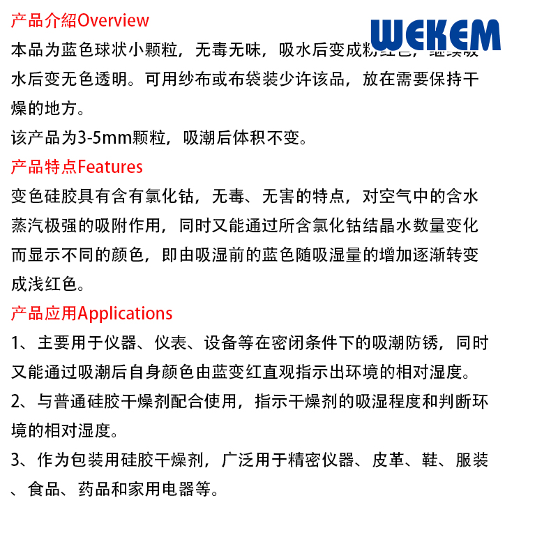 ·具有含有氯化钴,对空气中的含水蒸汽极强的吸附作用,同时又能通过所含氯化钴结晶水数量变化而显示不同的颜色,即由吸湿前的蓝色随吸湿量的增加逐渐转变成浅红色。