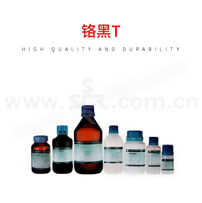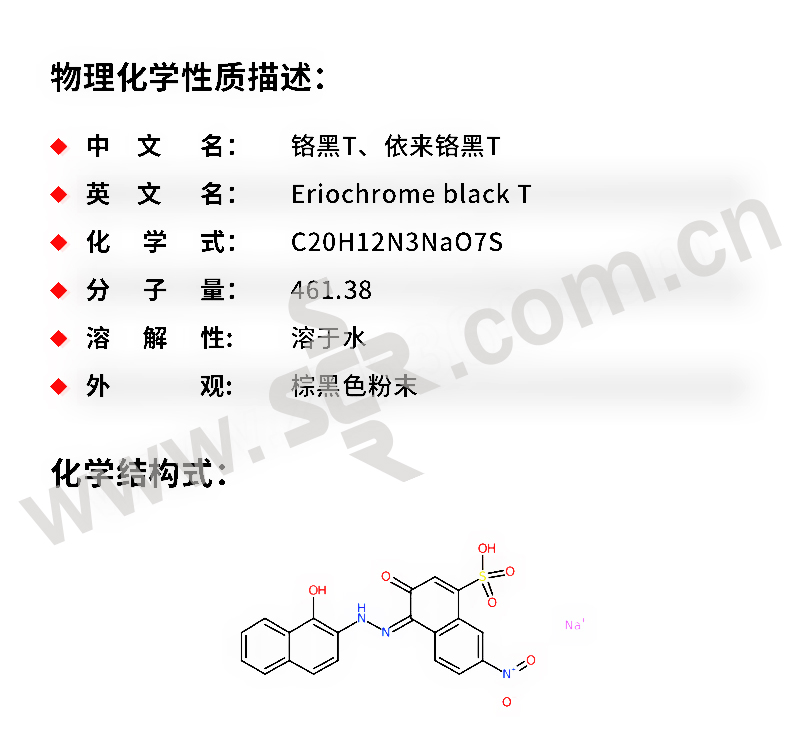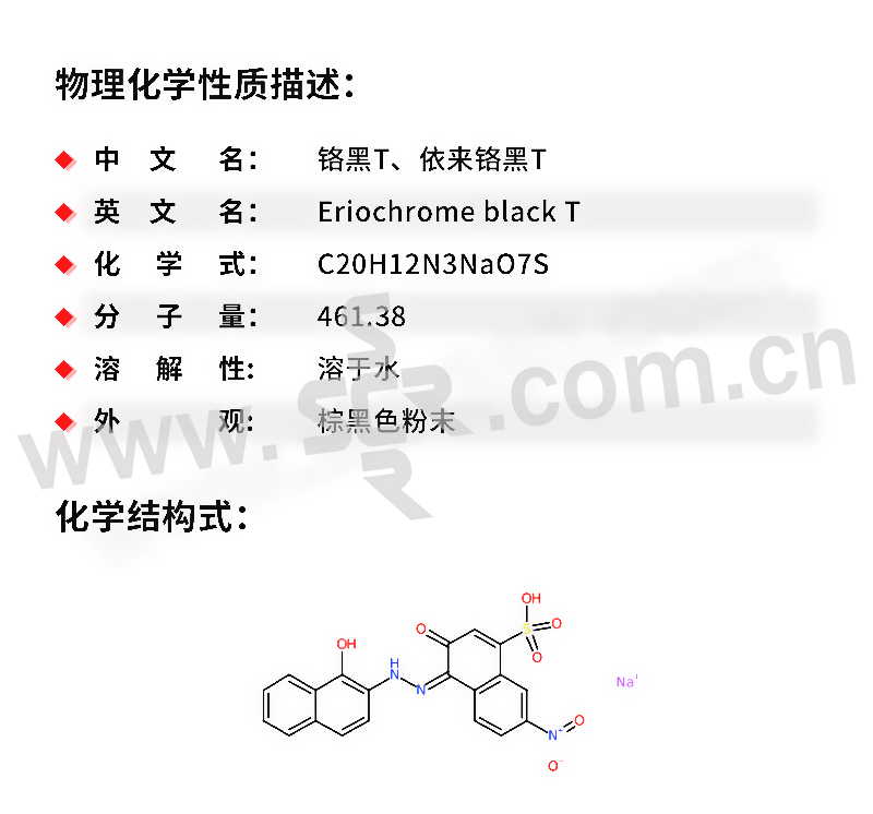 ﹒中文名称:铬黑T﹒英文名称:EriochromeblackT﹒分子式:C20H12N3NaO7S﹒分子量:461。38﹒性状:棕黑色粉末。溶于热水、冷却后成红棕色溶液、略溶于乙醇、微溶于丙酮。遇过量盐酸生成棕紫色沉淀、遇氢氧化钠成深蓝色、后变红色、溶于浓硫酸成蓝黑色溶液、稀释后生成棕色沉淀。遇浓硝酸成橙色溶液。