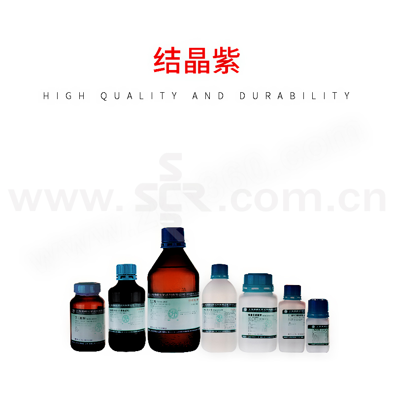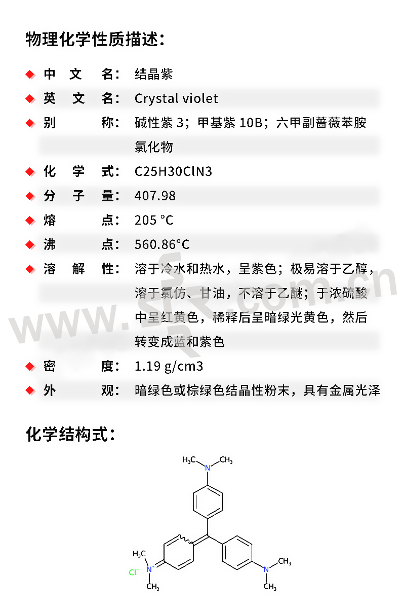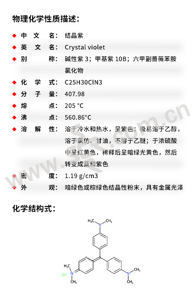 ﹒中文名称:结晶紫﹒英文名称:Crystalviolet﹒分子式:C25H30N3Cl﹒分子量:407。98﹒性状:绿色带有金属光泽结晶或深绿色结晶性粉末。为副品红的六甲基衍生物、含有少量四、五甲基的衍生物。1g溶于10ml乙醇、15ml甘油、溶于水和氯仿、水溶液和乙醇液呈紫色、几乎不溶于乙醚。中等毒、半数致死量(大鼠、经口)420mg/kg。有的商品为五甲基与六甲基玫瑰苯胺的混合物。