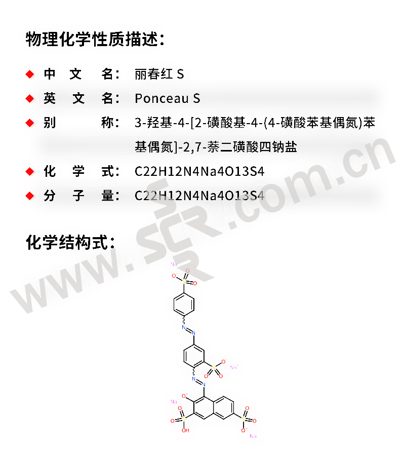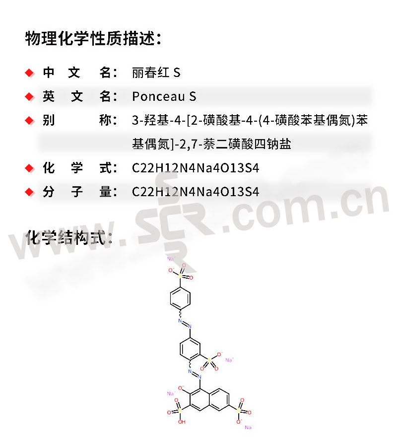 ·中文名称:丽春红S·英文名称:PonceauS·分子式:C22H12N4Na4O13S4·分子量:760。57·性状:棕色粉末。溶于水和乙醇、水溶液呈玫红色。最大吸收波长520(352)nm。有刺激性。