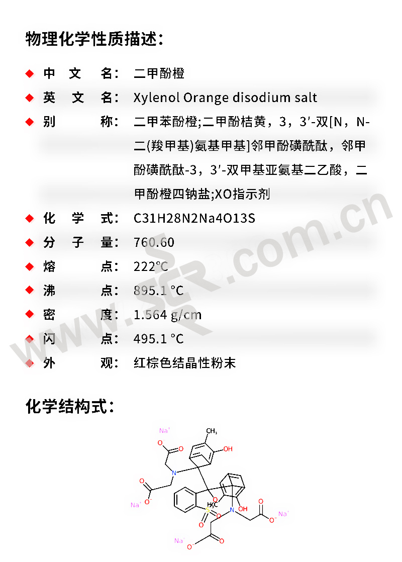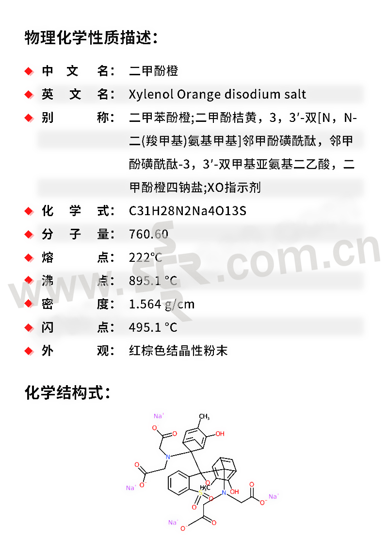 ·中文名称:二甲酚橙·英文名称:Xylenolorange·分子式:C31H29N2Na3O13S·分子量:738。61·性状:红棕色结晶性粉末。易吸湿。易溶于水、不溶于无水乙醇。水溶液为红色、酸性溶液中为柠檬黄色、金属络合物为鲜红色、碱性溶液中为红紫色。熔点210℃(分解)。最大吸收波长580nm。