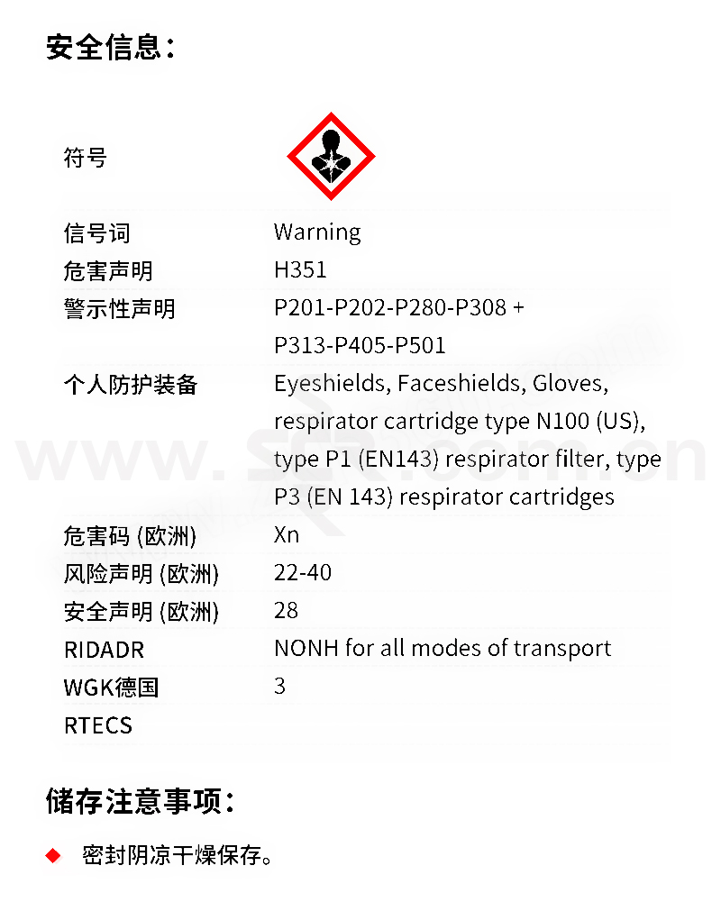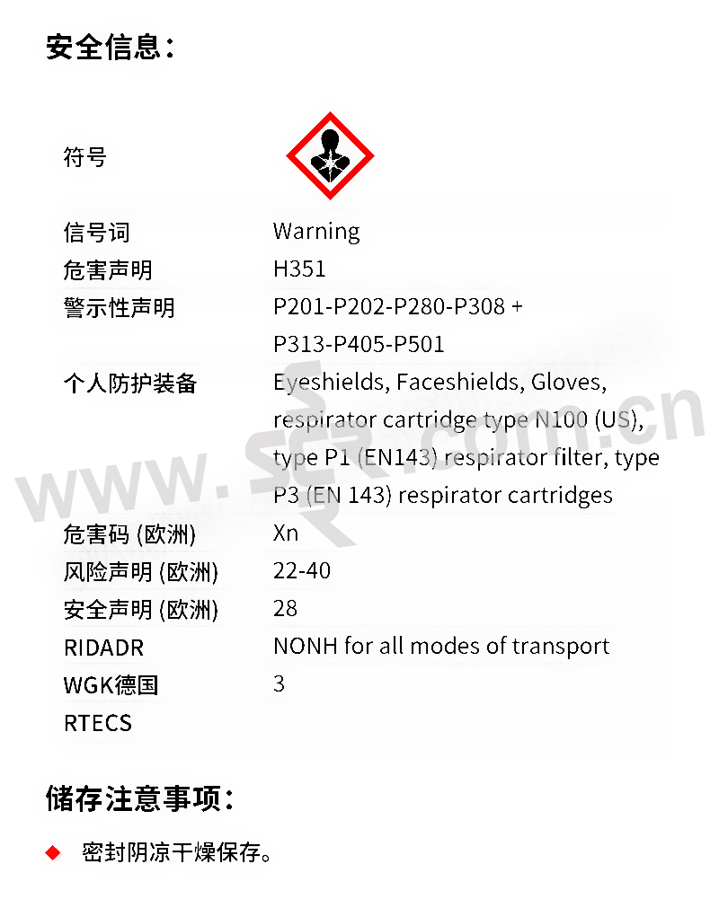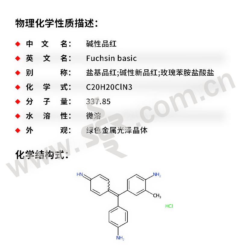 ·中文名称:碱性品红·英文名称:Fuchsinbasic·分子式:C20H19N3·HCl·分子量:337。85·性状:绿色金属光泽结晶。为品红和副品红(PArArosAnilinE)盐酸盐或乙酸盐的混合物。200℃以上分解。溶于乙醇和戊醇、微溶于水、溶液呈红色、不溶于乙醚。最大吸收波长(乙醇中)543nm(ε93000)。有毒。