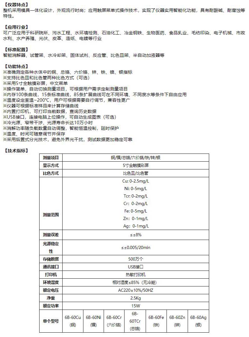 ·准确测定各种水体中的铜、总铬、六价铬、锌、铁、镍、银指标 ·支持比色皿和比色管两种比色方式(可选) ·采用5寸全触摸彩屏,中文菜单 ·操作简单,自动切换测量项目,可根据用户需求定制测量项目 ·内存100条曲线,15条标准曲线,85条扩展曲线可在不同环境、不同废水等条件下自由应用 ·温度设定室温~200℃,用户可根据需要自行调节,兼容性更广 ·仪器可根据标准样品来计算存储曲线 ·内置打印机,可打印当前数据,查询历史数据 ·USB接口,连接电脑上位操作,可自动生成图表(可选) ·冷光源、窄带干涉、光源寿命长