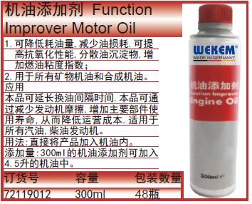 ·可降低耗油量,减少油损耗.可提高抗氧化性能,分散油沉淀物,增加燃油粘度指数; ·用于所有矿物机油和合成机油。 ·应用 ·本品可延长换油间隔时间.本品可通过减少发动机摩擦,增加主要部件使用寿命,从而降低运营成本.适用于所有汽油,柴油发动机。 ·用法:直接将产品加入机油内。添加量:300ml的机油添加剂可加入4.5升的机油中。