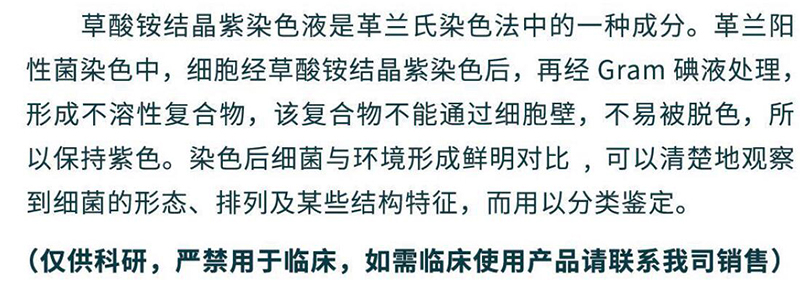 ·草酸铵结晶紫染色液是革兰氏染色法中的一种成分。革兰阳性菌染色中,细胞经草酸铵结晶紫染色后,再经Gram碘液处理,形成不溶性复合物,该复合物不能通过细胞壁,不易被脱色,所以保持紫色。染色后细菌与环境形成鲜明对比,可以清楚地观察到细菌的形态、排列及某些结构特征,而用以分类鉴定。