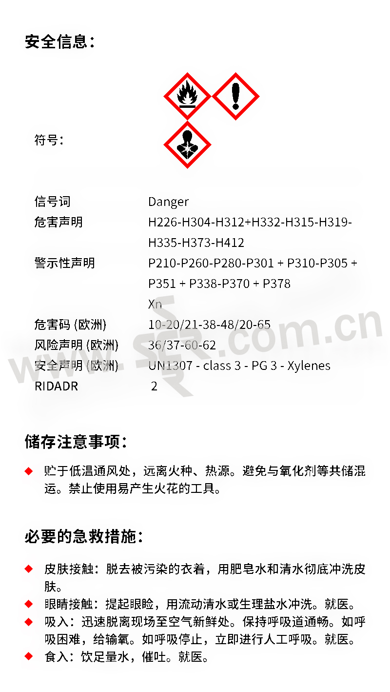 ﹒中文名称:二甲苯﹒英文名称:Xylene﹒分子式:C8H10﹒分子量:106。17﹒性状:无色透明液体。有芳香烃的特殊气味。系由45%~70%的间二甲苯、15%~25%的对二甲苯和10%~15%邻二甲苯三种异构体所组成的混合物。易流动。能与无水乙醇、乙醚和其他许多有机溶剂混溶、几乎不溶于水。相对密度约0。86。沸点137~140℃。折光率(n20D)1。4970。闪点29℃。