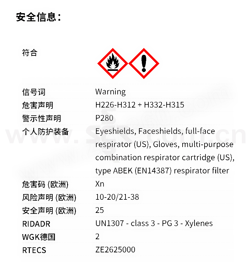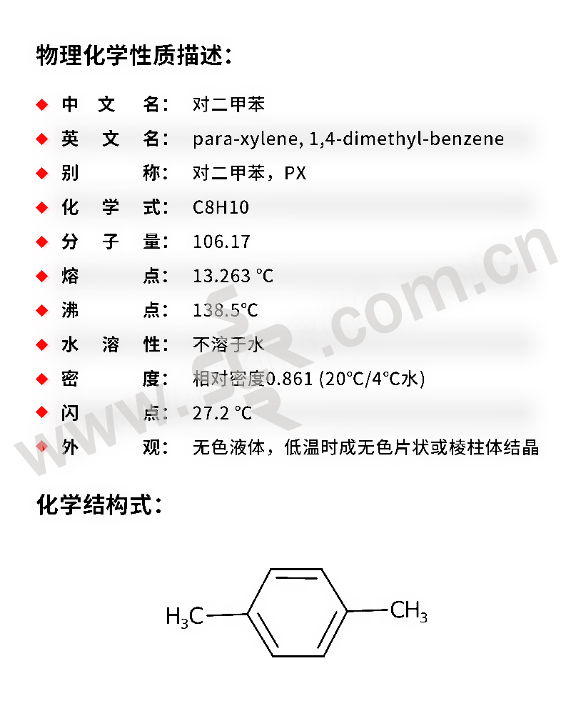 ·中文名称:对二甲苯·英文名称:p-Xylene·分子式:C8H10·分子量:106.17·性状:无色液体。低温时凝固成无色片状或棱柱状结晶。溶于乙醇、乙醚和其他许多有机溶剂、不溶于水。相对密度(d204)0.86104。熔点13~14℃。沸点137~138℃。折光率(n20D)1.49575。闪点(闭杯)25℃。易燃。蒸气能与空气形成爆炸性混合物、爆炸极限1.08%~6.60%(体积)。