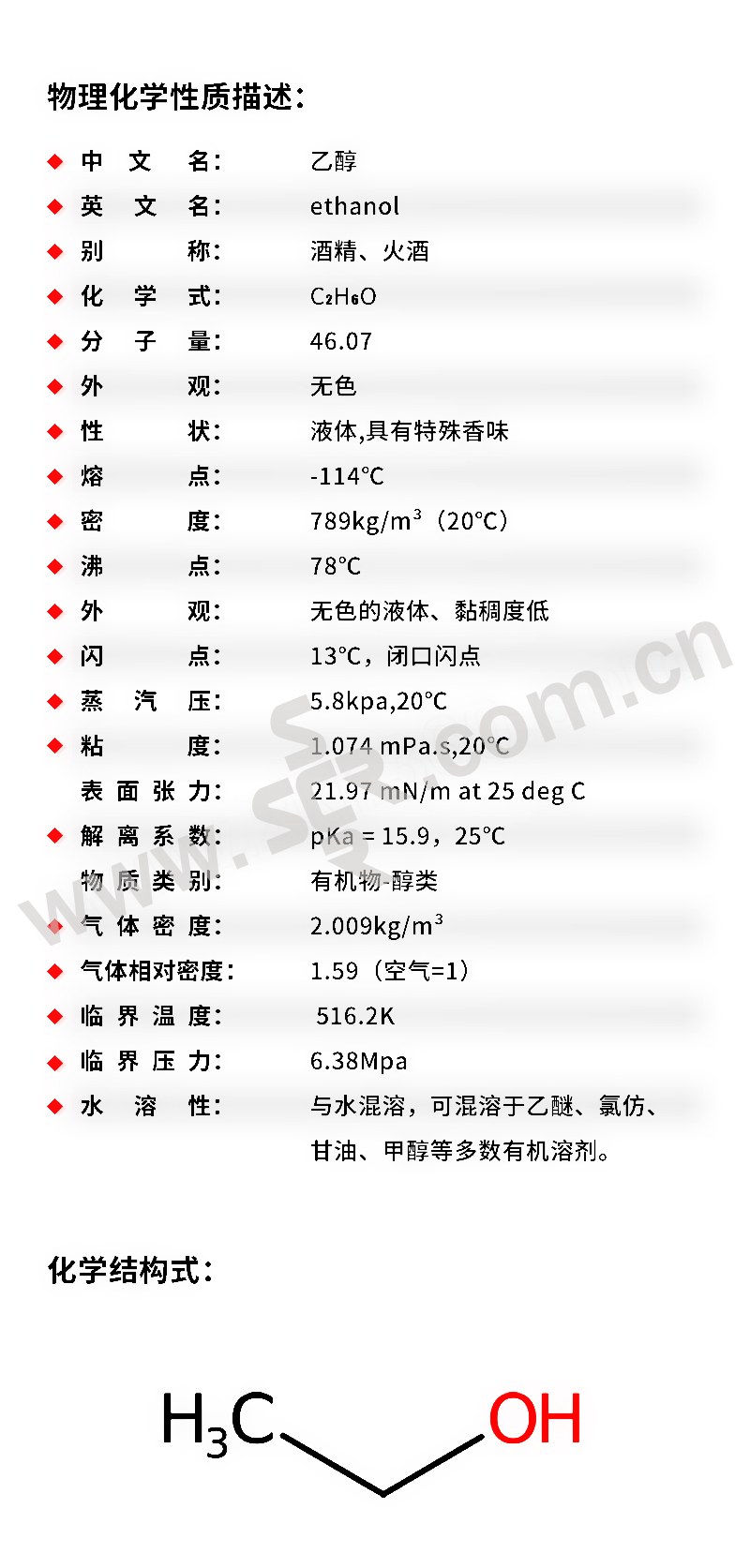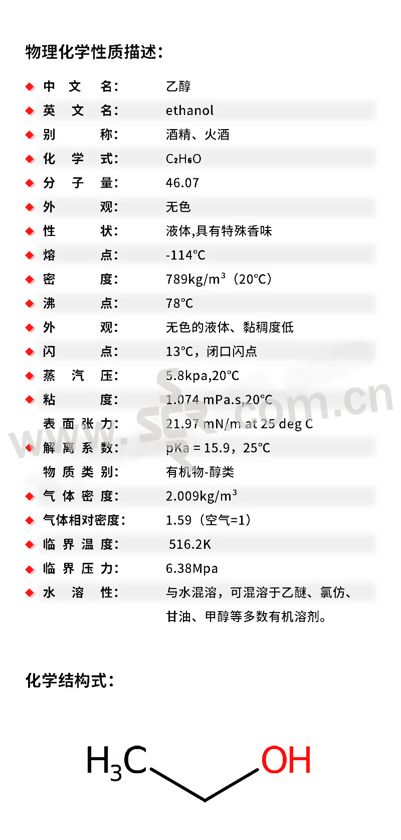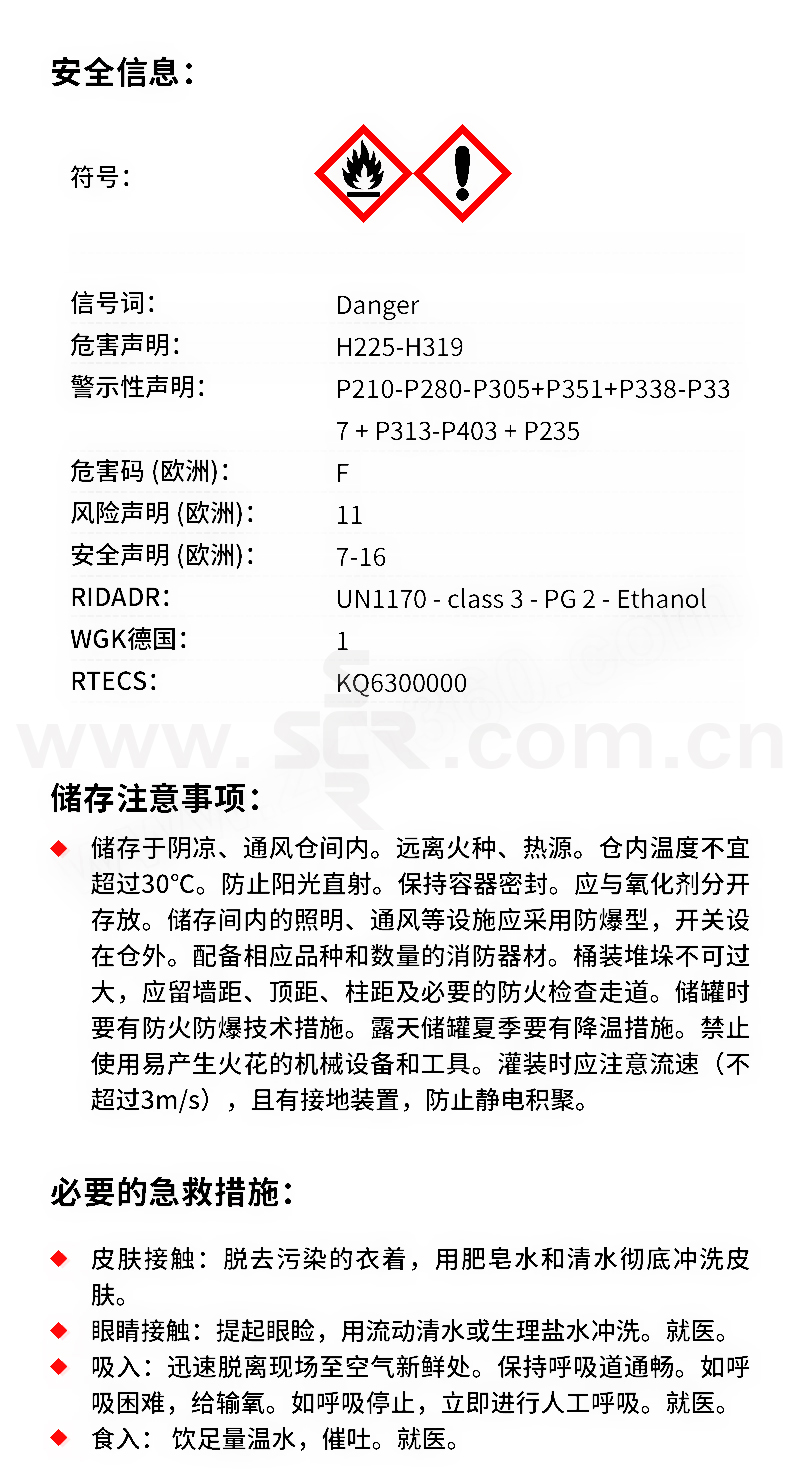 ·氯化钠·英文名称:75%Etanol·分子式:C2H6O·分子量:46.07·性状:无色澄清液体。有愉快的气味和灼烧味,易流动。很容易从空气中吸收水分,能与水和氯仿、乙醚等多种有机溶剂混溶。能与水形成共沸混合物(含水4.43%),共沸点78.15℃。相对密度(d204)0.789。熔点-114.1℃。沸点78.5℃。折光率(n20D)1.361。闪点(闭杯)13℃。易燃。