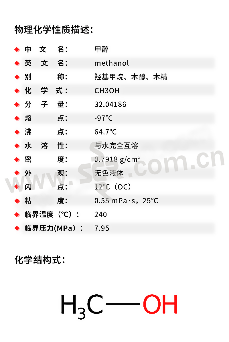 ·中文名称:甲醇·英文名称:Methanol·分子式:CH4O·分子量:32。04·性状:无色澄清液体。微有乙醇样气味。易挥发。易流动。燃烧时无烟有蓝色火焰。能与多种化合物形成共沸混合物。能与水、乙醇、乙醚、苯、酮类和其他有机溶剂混溶。溶解性能优于乙醇、能溶解多种无机盐类、如碘化钠、氯化钙、硝酸铵、硫酸铜、硝酸银、氯化铵和氯化钠等。相对密度(d204)