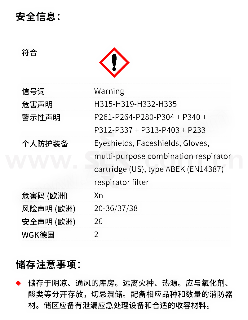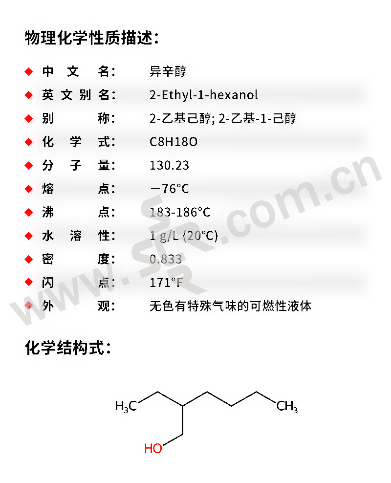 ﹒中文名称:异辛醇﹒英文名称:Isooctanol﹒分子式:C8H18O﹒分子量:130。23﹒性状:无色液体。溶于多数有机溶剂、微溶于水(1G溶于约720份水)。相对密度(d2020)0。8344。熔点-76℃。沸点184~185℃。折光率(n20D)1。4300。闪点(开杯)81℃。低毒、半数致死量(大鼠、经口)12。46ml/kG。有刺激性。