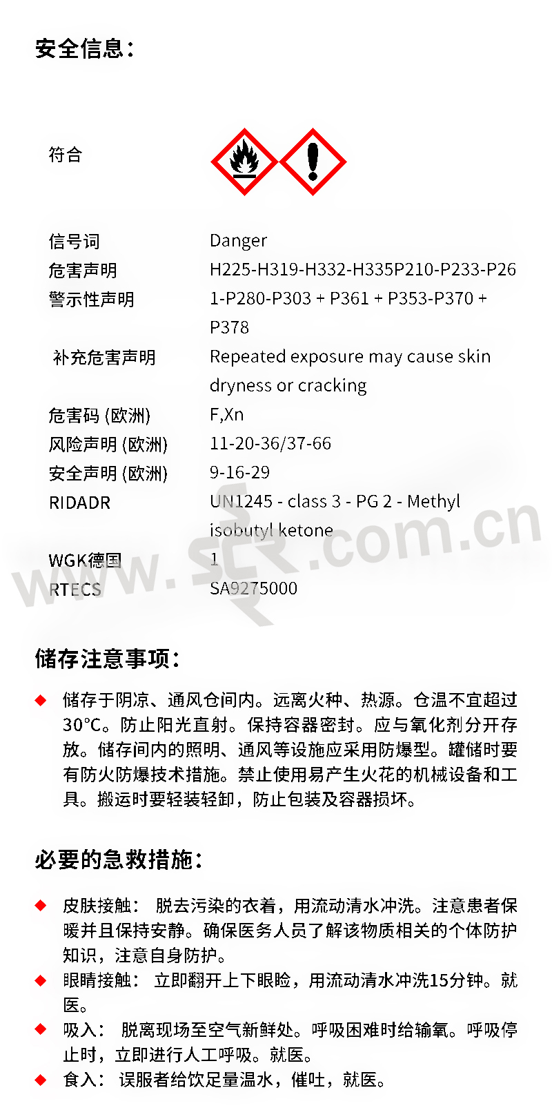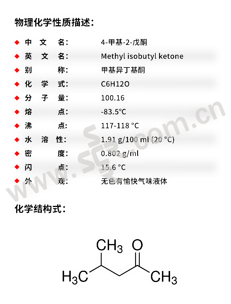 ·中文名称:4-甲基-2-戊酮·英文名称:4-Methyl-2-pentanone·分子式:C6H12O·分子量:100。16·性状:无色液体。有芳香酮和樟脑气味。能与乙醇、苯、乙醚和多数有机溶剂混溶、微溶于水(1。9%)。相对密度(d204)0。801。熔点-84。7℃。沸点117~118℃。折光率(n20D)1。396。闪点23℃。易燃。蒸气能与空气形成爆炸性混合物、爆炸极限1.3%~8.0%(体积)。低毒、半数致死量(大鼠、经口)