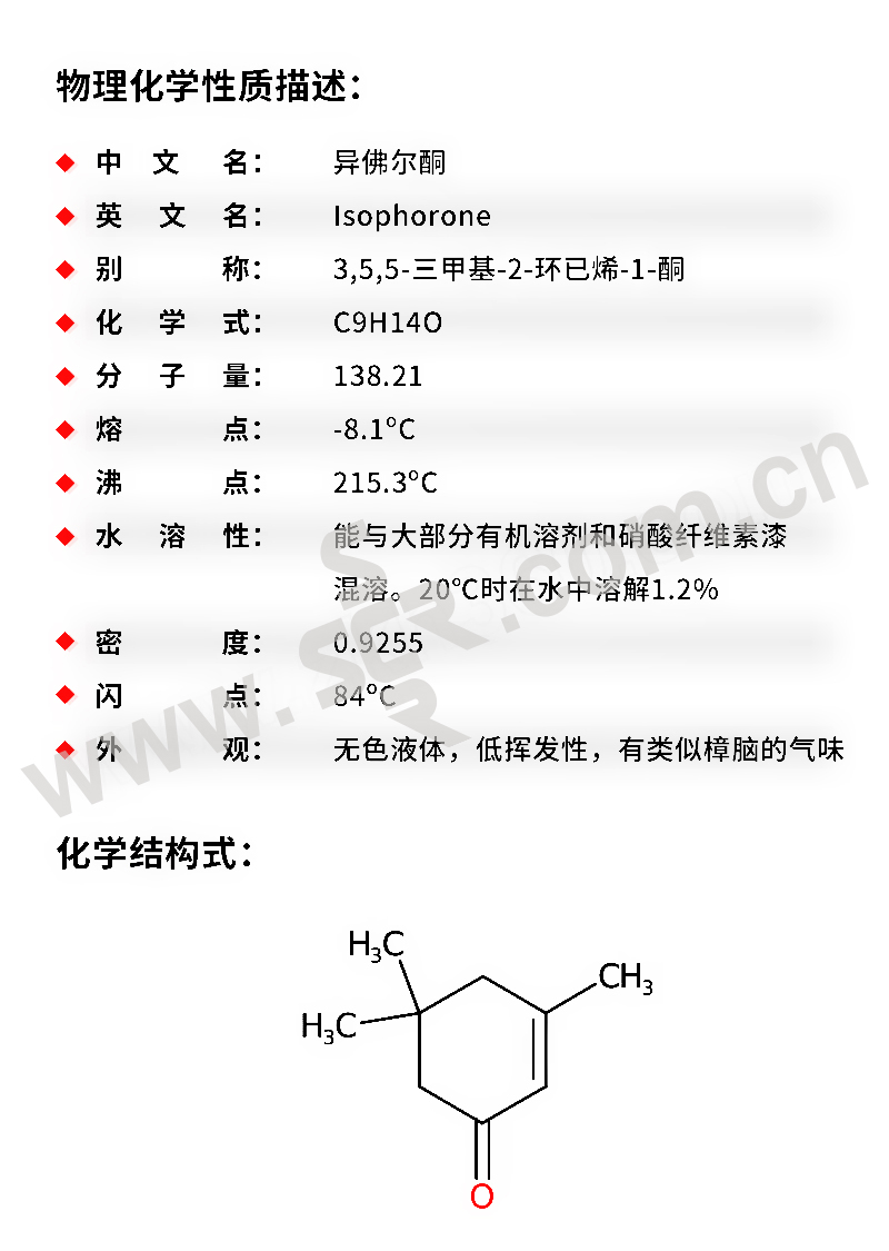 ﹒中文名称:异佛尔酮﹒分子式:C9H14O﹒分子量:138。21别名:异佛尔酮、异福尔酮、3、5、5-三甲基-2-环己烯-1-酮﹒性状:有樟脑样气味。露光变成二聚物、在空气中氧化生成4、4、6-三甲基-1、环己二酮。溶于醇、乙醚和丙酮、能与多数有机溶剂混溶、水中溶解度:12g/L(20°C)。有致癌可能性。有催泪性的刺激性。