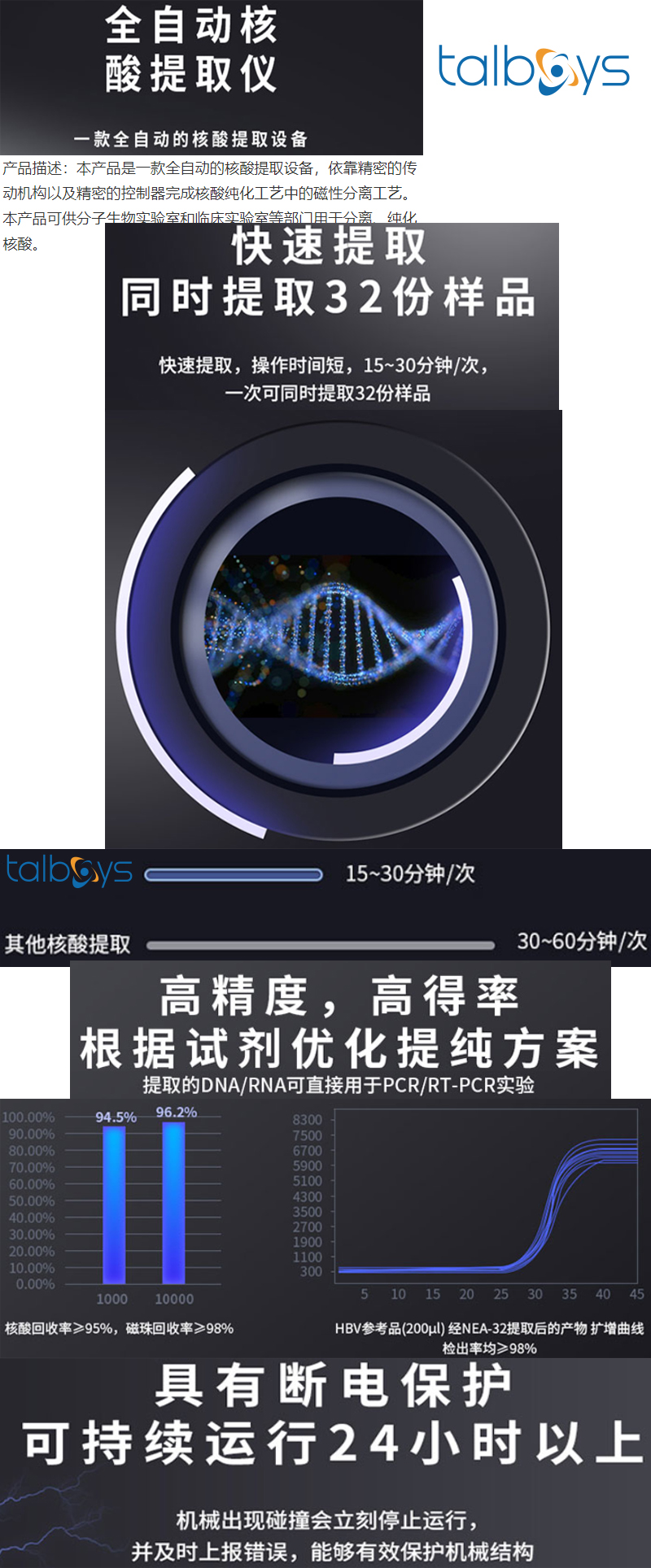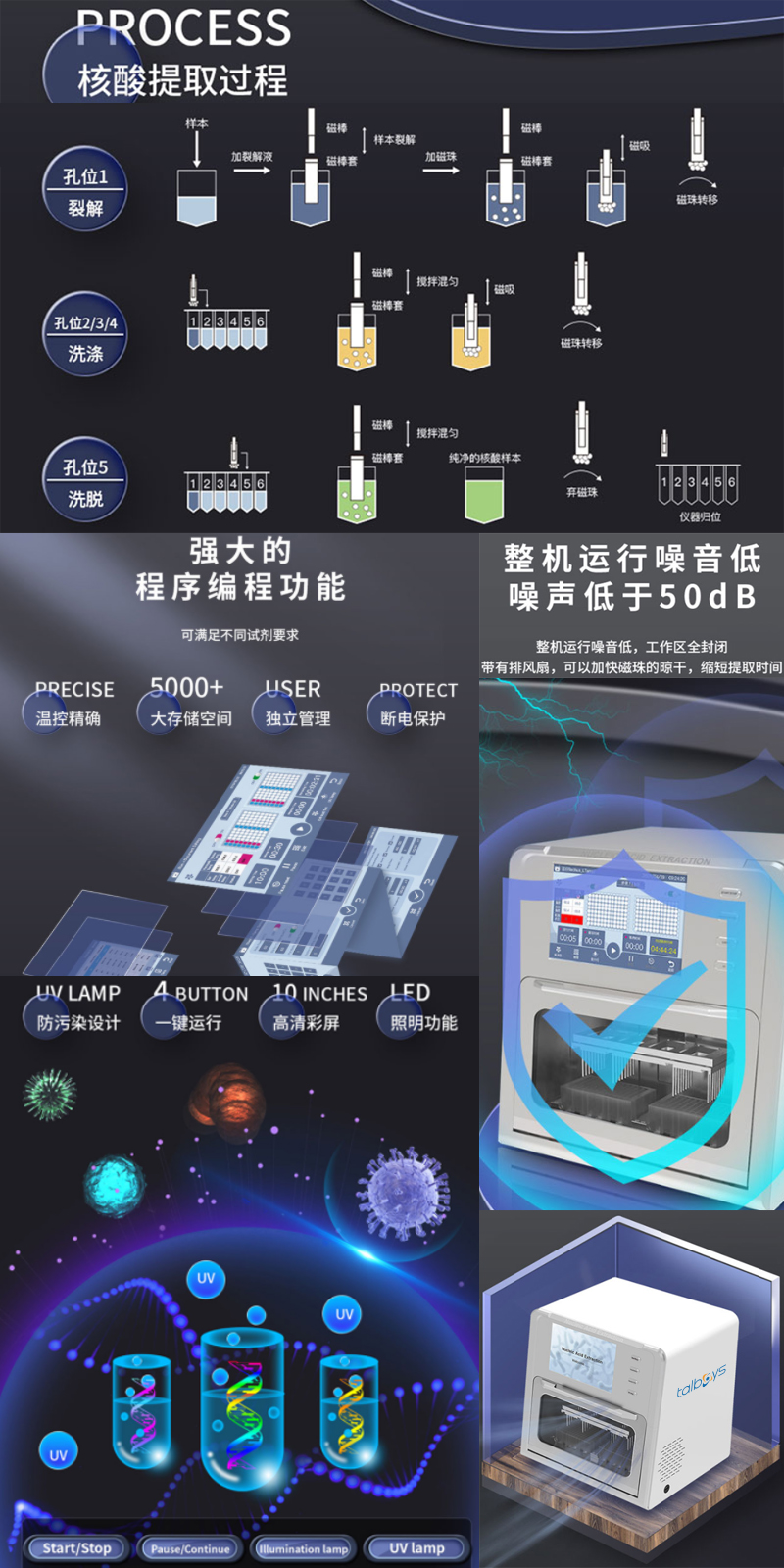 ·本产品是一款全自动的核酸提取设备,依靠精密的传动机构以及智能高效的控制器完成核酸纯化工艺中的磁性分离工艺。