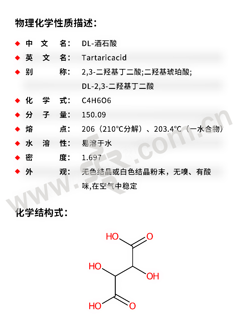 ﹒中文名称:DL-酒石酸﹒英文名称:DL-Tartaricacid﹒分子式:C4H6O6﹒分子量:150。09﹒性状:白色结晶。系左旋与右旋酒石酸的等量混合物。乙醇中溶解度(g/100g):2。006(0℃)、3。153(15℃)、5。01(25℃)、6。299(40℃)、乙醚中溶解度约1%。也有含1分子结晶水的。其水中溶解度(g/100g):14。00(10℃)、20。60(20℃)、29。10(30℃)、43。32(40℃)、99。88(70℃)、194。91(10