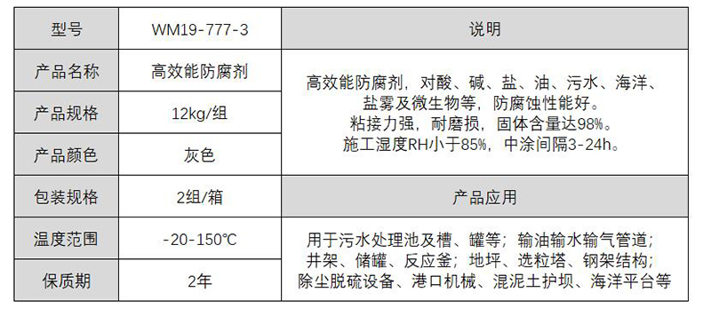 ·高效能防腐剂,对酸、碱、盐、油、污水、海洋、盐雾及微生物等,防腐蚀性能好。 ·粘接力强,耐磨损,固体含量达98%。 ·施工湿度RH小于85%,中涂间隔3-24h。